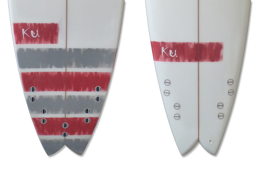 This 7'0" KU fish surfboard is a great board for the larger guy or for progressing off a minimal. It has extra volume to make it easier to paddle and a touch more upfront to make catching waves easier. A flatter rocker (curve) adds the speed once you are up and surfing. Plus you get to choose from two setup options for your fins: The traditional 3-fin (thruster) setup for more control or try a quad (4-fin) setup for extra speed and looseness. Both sets of fins are included with your board for free. This fish surfboard template has been refined over the years to a proven design and continues to get great feedback. Note: the photo is the same design in fibreglass but board is Epoxy.
